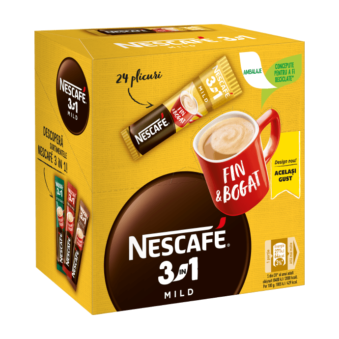 Creeaza momente impreuna cu prietenii si NESCAFÉ 3in1 Mild: combinatia perfecta dintre aroma bogata si gustul fin al cafelei, de fiecare data. Un mix de cafea surprinzator, pentru o experienta uimitoare de savurat impreuna. NESCAFE 3in1 Mild iti ofera intr-un plic savoarea bogata a cafelei, echilibrata de gustul fin de lapte si zahar, desavarsite de o spuma fina.