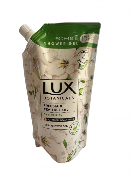 Gelul de dus LUX Botanicals cu Frezie si ulei din Arbore de Ceai este o inspiratie exotica ce iti purifica pielea si elimina stresul din viata de zi cu zi. Gelul de dus este imbogatit cu uleiuri botanice extrase din natura care ajuta pielea sa se simta catifelata si delicat parfumata.Puritate si serenitate. Lasa-te invaluita de un sentiment de liniste, intr-o gradina plina de miresme efervescente de frezie exotica si arbore de ceai
