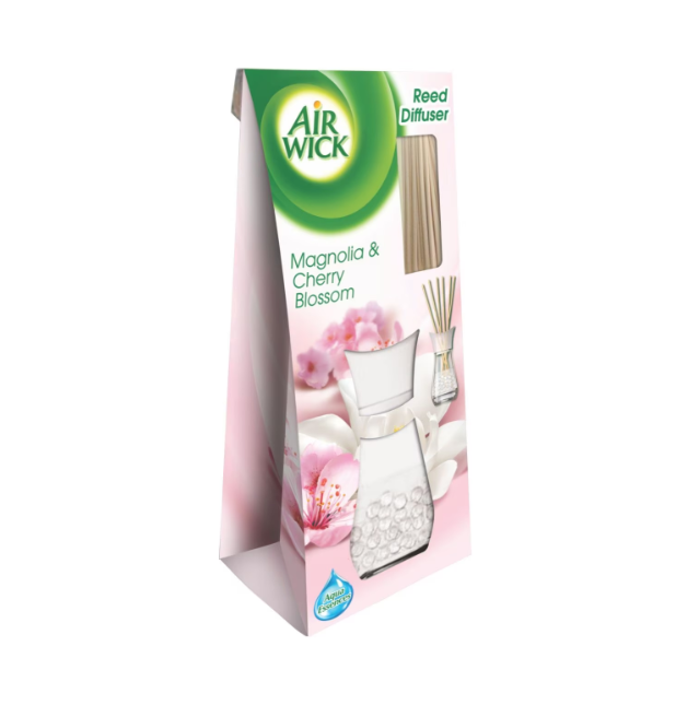 Descoperă prospetimea și eleganța în odorizantul pentru cameră Air Wick Reed Diffuser Essential Oils Magnolia & Cherry Blossom, cu o capacitate de 25ml.