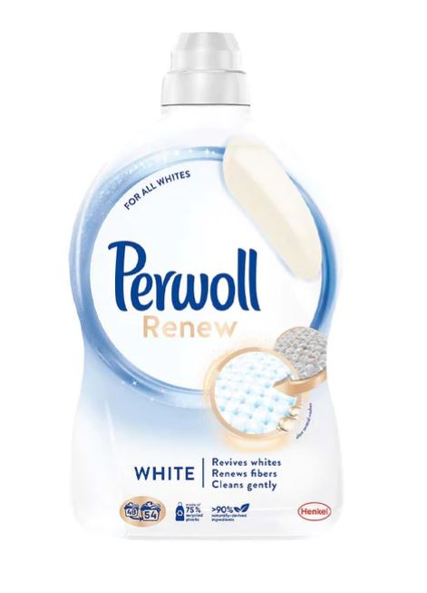 Detergentul Perwoll Renew White îngrijește hainele albe și nuanțele deschise, având un efect de reînnoire a culorilor și al fibrelor.